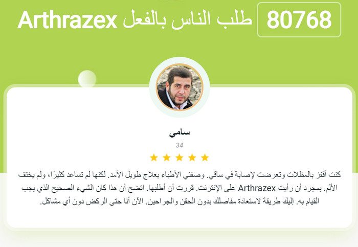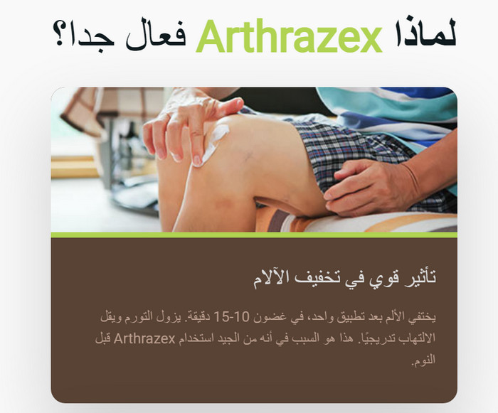 يوصي الخبراء Arthrazex كعلاج ممتاز لألم المفاصل والأربطة والعمود الفقري ، بالإضافة إلى الأمراض التي تسببها التغيرات المرتبطة بالعمر. نضمن لك تأثير سريع وطويل الأمد!